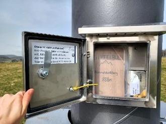 So sieht die Stempelstelle am Himmeldunkberg aus. Wer den 888 m hohen Berg erklommen hat, kann sich hier den Stempel für seinen Gipfelpass holen und sich im Gipfelbuch des Rhönklubs eintragen.