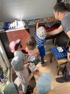 Familie Hergenhan aus Unterweißenbrunn hat den Kindergarten St. Katharina zu einer Besichtigung ihres Hühnermobils eingeladen. Die Kinder durften selbst die Eier rausnehmen und über das glückliche Leben der Hühner viel erfahren. Auch mal ein Huhn streicheln war für die Kinder ein Erlebnis. Voller Stolz trugen die Kinder ihre Eier mit nach Hause, manche wollten mit der Mutti einen Kuchen backen, manche gekocht verzehren oder als Rührei. Vielen Dank an Julia und Frank Hergenhan für den tollen Einblick!