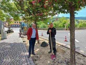 Bürgermeister Georg Seiffert und Landschaftsgärtner Thomas Möller vom Bauhof freuen sich schon, dass Bischofsheim in den nächsten Monaten durch die eingearbeiteten bienenfreundlichen Pflanzen noch bunter aufblühen wird.