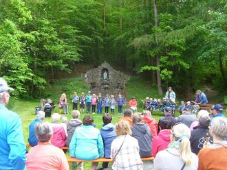 Gemeinsam wanderten viele Großeltern mit ihren Enkelkindern zur Mariengrotte. An der Grotte feierten wir gemeinsam eine Maiandacht mit Liedern und ein Naturmandala. Unterwegs sammelten die Kinder die Wiesenblumen, die sie dann zu einem großen Herz legten. Im Anschluss stärkten wir uns mit Kuchen und Getränke. Bei wunderschönem Wetter ließen wir den Tag bei netten Gesprächen ausklingen. Das Resümee war „das können wir wieder machen“. Kindergarten St. Katharina, Kerstin Haun
