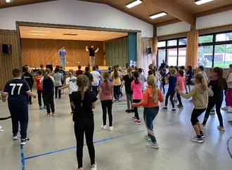 Während die einen ausdauernd liefen oder die Läufer anfeuerten, konnten die anderen in der Sporthalle einen mitreißenden Hip-Hop Schnupperkurs von den Profis Tristan Kempf und Florian Kleiner vom Tanzhaus in Bad Neustadt genießen. Die Kinder der ersten bis zur vierten Klasse waren begeistert und riefen einstimmig "Cool!".