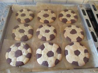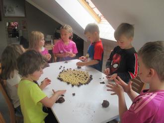 Als hauswirtschaftliches Angebot hatten die Kinder die Gelegenheit dicke Fußballkekse zu backen. Hierfür wurden zwei verschiedene Teige- ein heller und ein dunkler- hergestellt, für welche die Kinder alle Zutaten richtig abmessen durften. Der Plätzchenteig wurde von Hand geknetet und wir achteten darauf, wie ein Bäcker mit dem Handballen zu kneten und nicht den Teig nur zwischen den Fingern zu matschen. Nun bestand die Aufgabe darin den Teig zu vielen Kugeln zu rollen, die alle die gleiche Größe haben sollten, also weder zu winzig noch zu groß sein durften, um einen einheitlichen Keks zu bekommen. Der nächste anspruchsvolle Arbeitsschritt war die Kugeln zu einem bestimmten Muster zusammen zu setzen, um tatsächlich das Aussehen eines Fußballs zu erhalten. Durch leichtes Plattdrücken und rund Ausstechen wurde die Form perfektioniert.