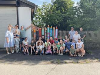 Freitagmittag machten sich die Vorschulkinder mit dem öffentlichen Bus auf und fuhren in den Schlosspark nach Gersfeld. Dort wurde der Spielplatz, das Tretbecken und der Barfußpfad erkundet. Bei sonnigen Temperaturen durfte natürlich der Besuch in der Eisdiele nicht fehlen. Den Hunger stillten wir dann im Biergarten bei Pommes und Pizza. Am Abend saßen wir um einer Feuerschale, dabei wurden Marshmallows erhitzt, Stöcke geschnitzt und natürlich mit Limo angestoßen. Dann übernachteten alle sehr müde im Turnraum, da durfte natürlich das Bett-Kino nicht fehlen. Am Morgen frühstückten wir mit den Eltern noch zum Abschluss. Die Vorschulkinder überraschten uns mit einem überdimensionalen, selbst gestalteten Holzstift. Diese Stifte zieren jetzt als Erinnerung den Holzzaun am Kindergarten Vielen Dank, eine wirklich sehr schöne Idee.