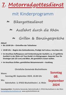 7.Motorradgottesdienst, am Sonntag den 08.09.2024 um 10 Uhr Christliche Gemeinde, Bahnhofstraße 3, Bischofsheim