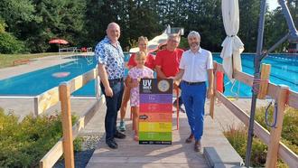 Das Freibad in Bischofsheim informiert ab sofort alle Besucherinnen und Besucher mit einer neuen UV-Index-Tafel über die aktuelle UV-Strahlung – und trägt damit aktiv zu einem besseren Sonnenschutzverhalten bei. Die Tafel wurde in Zusammenarbeit mit der AOK Schweinfurt im Freibadbereich angebracht.