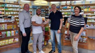 Georg Seiffert (li.) begrüßt Mazen Ballan (2. v. li.) als neuen Inhaber der Löwenapotheke. Jörg Rössler (2. v. re.) und seine Frau (re.) stehen ihm weiterhin mir Rat und Tat zur Seite.
