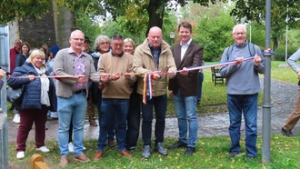 Zur Übergabe der Boules-Bahn durchtrennten die beiden Bürgermeister das Band. Von rechts Jean-Louis Mouret (Präsident Komitee Manduel), Staatssekretär Sandro Kirchner, Bischofsheims Bürgermeister Georg Seiffert, Manduels Bürgermeister Jean-Jaques Granat und Gerhard Nägler (Präsident Komitee Bischofsheim). Dahinter von links Marie Messines und Isabel Alcaniz Lopez, beide Stadträtinnen aus Manduel und Valérie Granat, die Frau des Mandueler Bürgermeisters.