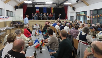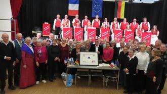 Die Gruppe der Französischen Freunde stellte sich vor der Bühne der Rhönhalle zu einem Erinnerungsbild. Dahinter die Haselbacher Trachtenkapelle, die dem Abend einen festlichen Musikalischen Rahmen gab.