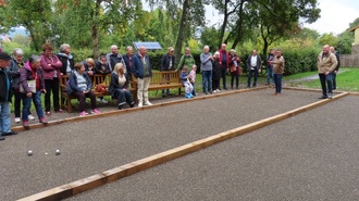 Direkt nach der Eröffnung begann das Spiel auf dem neuen Boules-Platz, auf der Tafel ist der Anlass festgehalten, rückseitig stehen die Spielregeln.