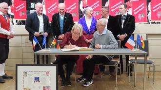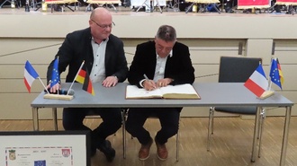Anlässlich der 20-Jährigen Partnerschaft zwischen Bischofsheim und Manduel trugen sich die Bürgermeister Georg Seiffert (Bischofsheim) und Jaques Granat (BGM Manduel) ins Goldene Buch der Stadt ein.