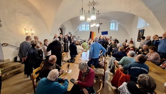 Empfang im Rentamt bei Weißwurst und Brezeln. Die Patres Georg Andlinger und Othmar Brüggemann vom Kloster Kreuzberg waren auch gekommen. Pater Andlinger übernahm spontan und souverän das Dolmetschen.