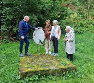 Bürgermeister Georg Seiffert genoss sichtlich die Geschichten der drei Damen und freut sich über das Schild am Storchenstein.