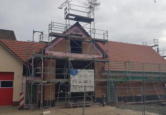 Nach dem Richtfest mit Richtspruch und einer kleinen Feier mit den fleißigen Handwerkern und Feuerwehrleuten schreitet die Erweiterung des Feuerwehrhauses in Wegfurt weiter voran.