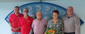Verabschiedung in den „endgültigen“ Ruhestand. v.l.n.r. Bäderbeauftragter Manfred Markert, Bäderaufsicht Dieter Kalmund, Wolfgang Gundelach, Rosi Gundelach, 1. Bürgermeister Georg Seiffert.