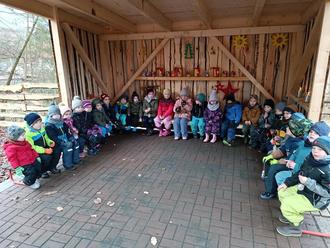 Die neue Waldhütte im Kindergarten eigenen Wald war weihnachtlich geschmückt und so zu einer stimmungsvollen Feier eingeladen.