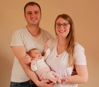 Pauline Schodorf mit ihren stolzen Eltern Theresa und Daniel Schodorf aus Unterweißenbrunn