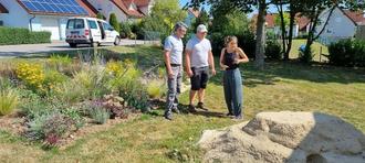 Die Bischofsheimer Harald Tratt (Bauhofleiter) und Thomas Möller (Bauhof) im Gespräch mit Frau Dr. Maihoff von der Universität Würzburg