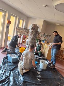 Diverse Materialien waren gesammelt, besorgt und bereitgestellt, um daraus Kunstwerke in Form von Skulpturen, Fotowandaufstellern o.ä. zu erschaffen. So wurde mit Pappe, Röhren, Holz und Kleister geklebt, geschraubt, befestigt, gemalt und gewerkelt, was der Handwerkskoffer hergab. Was dabei fehlte, wurde von den engagierten Papas noch von daheim geholt. So entstanden im Laufe des Abends 2 tolle Projekte. Da dies alle Laune machte, wurde auch gleich ein 2. Treffen zur Fertigstellung des ganzen Projektes ausgemacht.