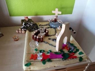 Am Gründonnerstag machten sich die Kindergartenkinder aus Unterweißenbrunn auf Osternestschatzsuche. Der Osterhase hat eine Schatzkarte im Kiga vorbeigebracht und so konnten die Vorschulkinder dank der Karte, den Weg zum Osternest finden. Die Vorschulkinder lotsten die Kindergartenkinder durch ganz Unterweißenbrunn, an der Kirche vorbei, an der Schule und an Kühen vorbei und schließlich dann auf dem Radweg zu landen. Nun ging es noch ein ganzes Stück auf dem Radweg entlang und vor einer Pferdekoppel musste abgebogen werden. Der Weg führte uns in einen Garten. Unter einem Baum war ein riesiges Osternest gefüllt. Die Kinder waren begeistert!!!! Im Kindergarten wurde der Kreuzweg kindgemäß gestaltet und danach wurden die selbst gebackenen Osterkekse vernascht.
