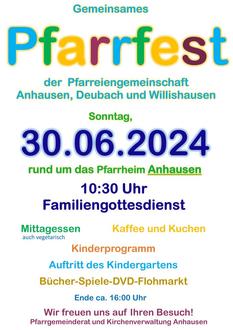 Am Sonntag, 30.6.2024 findet das gemeinsame Pfarrfest der Pfarreiengemeinschaft Willishausen-Anhausen rund um die Kirche und das Pfarrheim in Anhausen statt. Nach dem Familiengottesdienst um 10.30 Uhr gibt es leckeres Essen, Kaffee und Kuchen. Ein Bücherflohmarkt lädt zum Schmökern ein. Der Kindergarten wird eine kleine Aufführung zum Besten geben.
