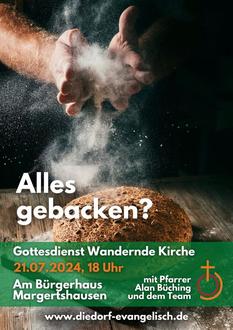 | 18.00 Uhr | Wandernde Kirche, Bürgerhaus Margertshausen (mit Pfr. Alan Büching und Team) Alles gebacken |