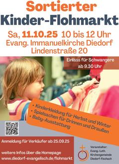 Am Samstag, 11. Oktober 2025 veranstaltet die Evang.-Luth. Kirchengemeinde Diedorf-Fischach in den Gemeinderäumen der Immanuelkirche in der Lindernstraße 20, Diedorf von 10 - 12 Uhr einen sortierten Flohmarkt. (Einlass für Schwangere ab 09:30 Uhr)