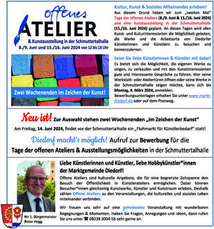 Am Freitag, 14. Juni 2024, findet vor der Schmuttertalhalle ein „Flohmarkt für Künstlerbedarf“ statt!