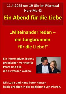 11. April: 19:00 Uhr Ein Abend für die Liebe im Pfarrheim mit Ehepaar Hauser von "Liebe Leben"