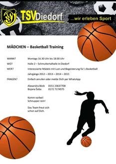 Immer montags von 16.30 bis 18.00 Uhr in der Schmuttertalhalle in Diedorf für alle interessierten Mädls mit Lust und Begeisterung fürs Basketball.