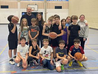 TSV-Verantwortlicher Horst Heinrich und FSJ-ler Lea Büschges mit den Kindern aus dem Basketballtraining