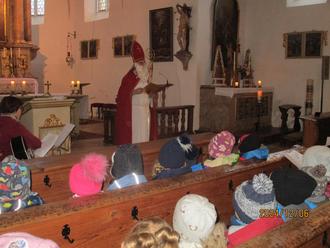 Die Kinder des Kindergartens trafen den Hl. Bischof Nikolaus in der Kirche St. Sebastian. Während eines Spaziergangs machten die 75 Kindergartenkinder mit ihren Betreuerinnen kurz Pause in der Kirche St. Sebastian. Dort gesellte sich dann der Bischof Nikolaus dazu und wurde von den Kindern natürlich begeistert empfangen. Nachdem die Lieder und Gedichtwünsche des Hl. Mannes erfüllt waren, wurden die Kinder natürlich noch mit einem kleinen Geschenk belohnt, ehe es zum Nikolausfrühstück an die festlich gedeckten Tische zurück in den Kindergarten ging.