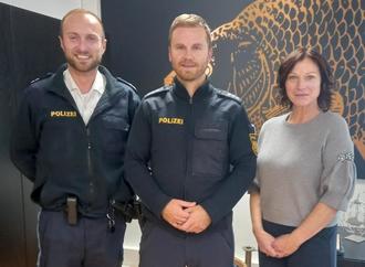 Leiter der Polizeistation Mario Mühlbauer (Mitte) stellte sich mit seinem Stellvertreter Patrick Dengler (li.) der Ersten Bürgermeisterin Heike Faltermeier (re.) vor.