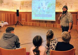 Nicht nur die zahlreichen Kinder staunten über seine Erzählungen, Fotos und Videos zu seinen Begegnungen im Wald, rund um den Arber. Von der zierlichen Tannenmaise bis zum stattlichen Rotwild, immerhin ein Vierzehnender, mit ca. 1,30 m Schulterhöhe, hat der bärtige Bodenmaiser schon alles vor die Linse bekommen. Sein Rezept für gute Tieraufnahmen: Geduld und passives Verhalten. Oft sitzt oder liegt er stundenlang, bis die Tiere ihm vertrauen und neugierig auf ihn zukommen.
