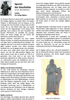 In dieser Ausgabe des Brucker Mitteilungsblattes findet sich die 50. Folge der „Spuren der Geschichte“, die ich in den vergangenen vier Jahren als Ortsheimatpfleger verfasst habe. Mit unserem Pfarrpatron Ägidius geht diese Serie nun zu Ende. Es war mir ein Anliegen, die Bürgerinnen und Bürger unseres Marktes anhand von noch vorhandenen Spuren mit auf Entdeckungsreise in die Heimatgeschichte zu nehmen. Ich hoffe, auf anschauliche Weise einen unterhaltsamen Beitrag und zugleich ein tieferes Verständnis der Vergangenheit geleistet zu haben.