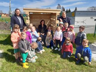 Die Kinder, das Team des Kindergartens und die Bürgermeisterin bedanken sich sehr herzlich bei den beiden Baumeistern, sowie dem Geschäftsführer der Firma ZMT, Herrn Siegfried Schmid für die Überlassung der Holzpaletten.