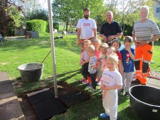 Der Garten wird wieder, dank den Mitarbeitern vom gemeindlichen Bauhof, auf Vordermann gebracht. Fallschutzmatten zur Sicherheit bei der Rutsche und Vorbereitungen für ein neues Spielhaus wurden getroffen. Fundamente ausgegraben und betoniert. Immer wenn uns die Bauhofmitarbeiter besuchen, verfolgen die Kinder staunend die jeweiligen Arbeiten.