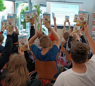 Anschließend wurde der Comic-Roman "Volle Fahrt ins Abenteuer" vorgestellt, das lustige Video "Das ist ein Buch" von Lane Smith gezeigt und die Geschichte vom "Bücherfresser" vorgelesen. Danach durften die Schüler*innen ausgiebig in der Bücherei schmökern.