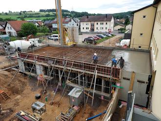 Der Anbau des neuen Werkraums mit Maschinen- und Nebenraum an der Nordseite des Bauabschnitts I unserer Grund- und Mittelschule verläuft planmäßig und liegt voll im Zeitplan. Die Doppelwandelemente sind bereits aufgestellt, und die Decke wurde erfolgreich betoniert.