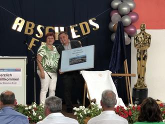 Rektor Markus Binder bei der Überreichung des Abschiedsgeschenks an Barbara Greber.
