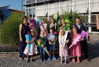 Die ABC Schützen der Klasse 1/2 b mit Klassleitung Andrea Wilsdorf (li.) und Rektor Markus Binder (re.)