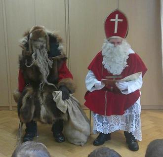 Als die Tür sich öffnete, konnten wir es kaum glauben, wer auf einmal im Raum stand: Es waren der Nikolaus und sein Gehilfe Knecht Ruprecht! Wir sangen das Lied: „Sei gegrüßt, lieber Nikolaus“ und noch weitere Lieder aus unserem Adventskreis vor. Wir zeigten den beiden auch ein Mitmachgedicht: „Der Nikolaus aus dem kleinen Haus“.