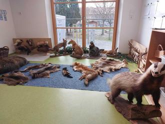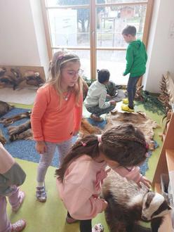 Ein weiteres Highlight der Woche war der „Anhänger“ des bayerischen Jagdverbands der Kreisgruppe Neu-Ulm. Dieser war mit faszinierenden Präparaten von Waldtieren, Fellen, Geweihen und Informationsmaterialien ausgestattet. Die Kinder konnten im Gruppenraum Tiere wie Dachs, Hase, Fuchs, Wildschwein und verschiedene Vogelarten aus nächster Nähe betrachten. Besonders spannend war es, die weichen Felle der Rehe zu berühren und das beeindruckende Geweih eines Hirsches zu bestaunen. Die Kinder stellten viele Fragen zu den Tieren und deren Lebensweisen und brachten ihr Wissen ein. Es war beeindruckend zu sehen, wie viel sie bereits wussten und wie begeistert sie sich miteinander austauschten.