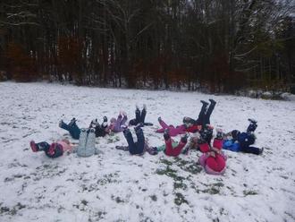 Zum Abschluss der Woche fiel über Nacht der Schnee und bedeckte die Wiesen mit einer dicken Schneeschicht. Wir machten uns auf den Weg in den Wald und entdeckten einzelne Tierspuren im Schnee. Auch der erste Schnee wurde genutzt, um Schneemänner zu bauen, den Hügel hinunterzurollen und einfach nach Herzenslust im Schnee zu spielen.