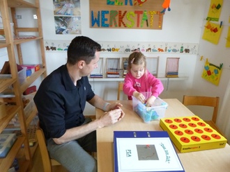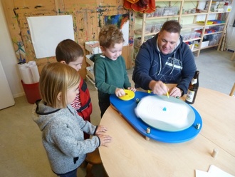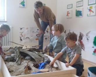 Frisch gestärkt machten sich alle auf den Streifzug durch den Kindergarten: Die Kinder zeigten, wo sie am liebsten spielen, die Farbschleuder wurde ausprobiert, in der Dinolandschaft gespielt, die Portfolioordner gewälzt, ganz viel erzählt und gelacht, Kaspertheater gespielt, gemeinsam gebaut, gemalt …