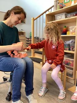 Anschließend durften alle Kinder selbst aktiv werden und das Zähneputzen an einem Modell üben. Die Begeisterung war groß und viele Kinder berichteten stolz von ihrem neu erworbenen Wissen.