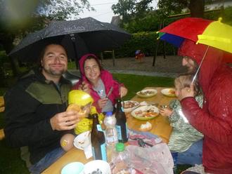 Während der Begrüßung und dem von den Kindern alleine einstudierten Fledermaustanz schien sogar kurz die Sonne. Dann zog es aber leider zu und fing zu regnen an. Die Grillstation mit Salatbuffet war in weiser Voraussicht unseres Grillmeisters Florian Häfele unter einem Pavillon im Trockenen untergebracht.