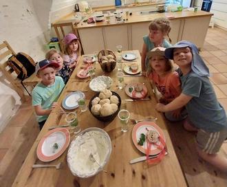 Mit unseren Schätzen sind wir in der Küche gelandet, wo wir für unser Mittagessen Kartoffeln gekocht, eigene Semmeln gebacken und mit den gesammelten Kräutern einen Kräuterjoghurt und Kräuterfrischkäse gemacht haben.