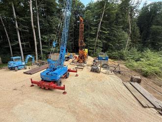 Nach der im Frühjahr/Sommer 2022 niedergebrachten Bohrung VB 1 Filzingen, die im Ergebnis gezeigt hatte, dass nur im oberen tertiären Grundwasserstockwerk (HGW1) ein nutzbares Grundwasservorkommen vorliegt, wurde zwischenzeitlich dicht daneben ein Brunnen (TB 2) mit Endbohrdurchmesser 800 mm und Ausbau NW400 niedergebracht.