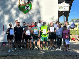 Nach der anschließenden Siegerehrung und einem Gruppenfoto vor unserem frisch gestrichenen Vereinswappen gingen wir in den gemütlichen Teil des Tages über. Bei kühlen Getränken und leckerem Grillgut ließen wir es uns noch richtig gut gehen und den Tag gemeinsam ausklingen.