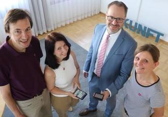 Freuen sich über die neue FamilienApp für den Landkreis Neu-Ulm (von links): Bernhard Brem (Kreisjugendpfleger am Landratsamt Neu-Ulm) Stefanie Gugler (Familienbildung), Landrat Thorsten Freudenberger und Renate Prager (KoKi – Frühe Hilfen). Foto: Landratsamt Neu-Ulm